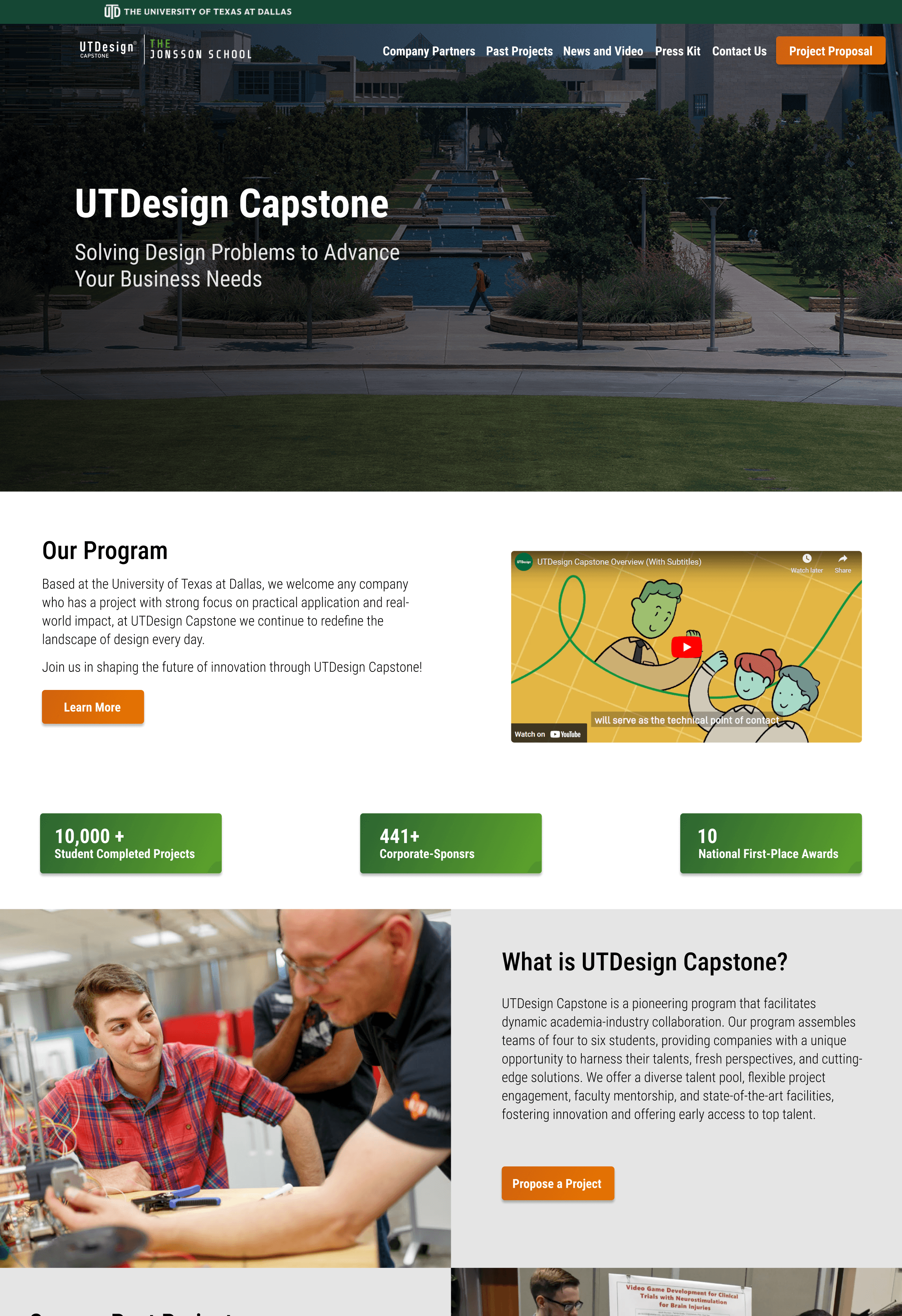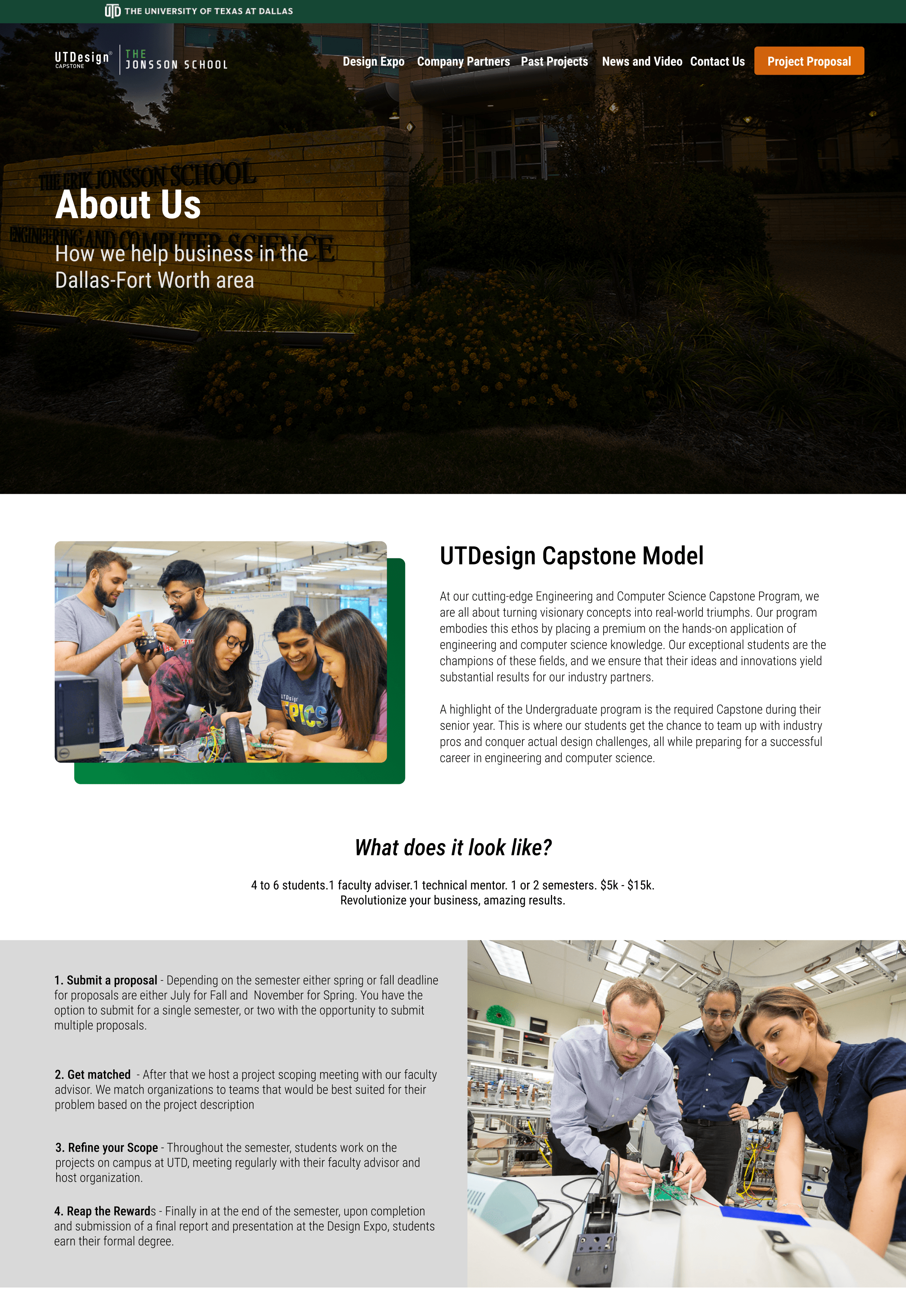 UTDesign Capstone connects senior engineering students with companies for real-world projects. But the old website made it hard for sponsors to get involved—key links were buried, and the navigation centered only on students. I led a full redesign to refocus the site around business goals. By surfacing sponsor information, clarifying calls to action, and aligning with UT Dallas branding, we made it easier for companies to partner with the program. Within a year, corporate sponsorships grew by 20%. The site now meets WCAG AA accessibility standards and delivers a clean, professional look that reflects the quality of the program.
